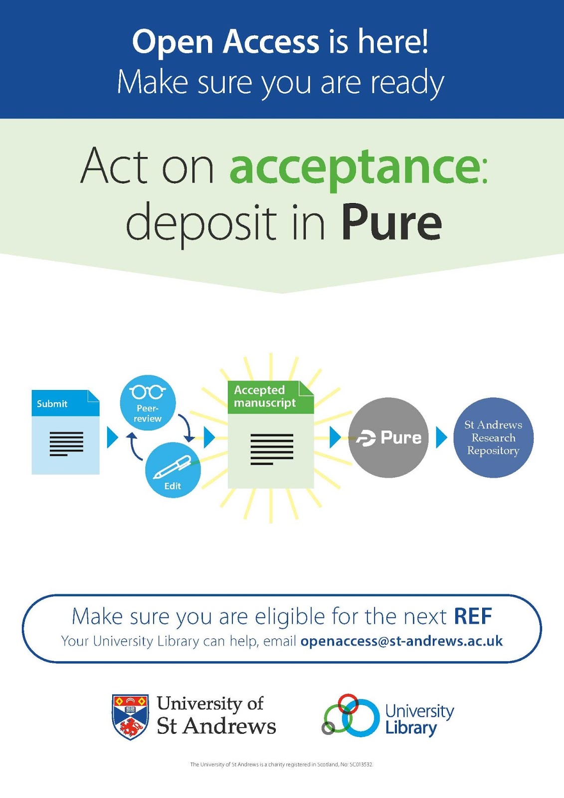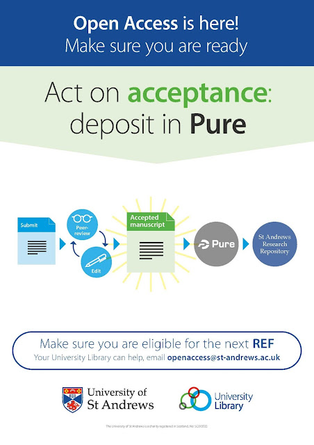 The Policy for open access in the post-2014 Research Excellence Framework is in force from April 1 2016, and states “to be eligible for submission to the next REF, authors’ final peer-reviewed manuscripts must have been deposited in an institutional or subject repository”. For St Andrews, this means that all researchers must deposit the accepted version of journal articles and conference proceedings in Pure as soon after acceptance as possible. In common with other institutions, the Library has been promoting the message ‘Act on acceptance: deposit in Pure’. This applies not just for REF and all authors should deposit their manuscripts. The Library’s Open Access support team can help with this process.